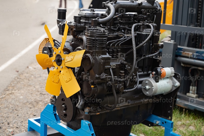 Двигатель с желтыми лопатками на синей стойке под открытым небом в промышленных условиях