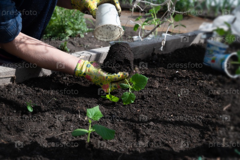 Женские руки в садовых перчатках держат огурцы перед посадкой в почву, пространство для текста