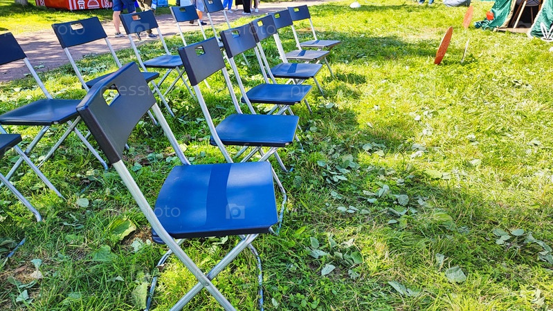 Пустые синие стулья на травянистом участке в солнечный день на мероприятии под открытым небом