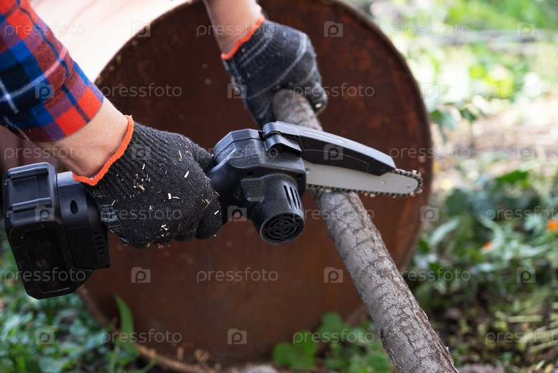 Человек в перчатках пил деревянный ствол с помощью пилы