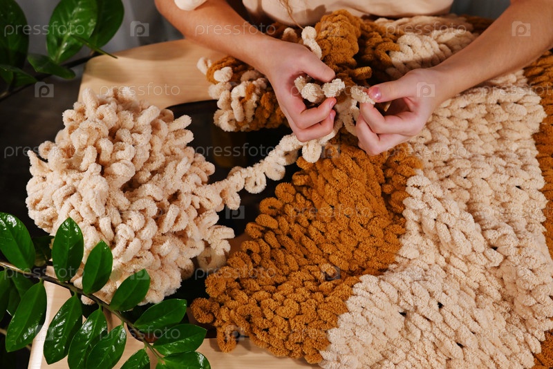 Создание уютной текстуры из пряжи в теплых тонах во время творческой сессии дома