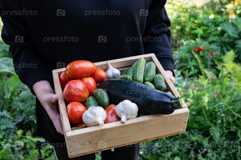 Свежесобранные овощи, включая огурцы, помидоры и чеснок в деревянной коробке вокруг травы в саду