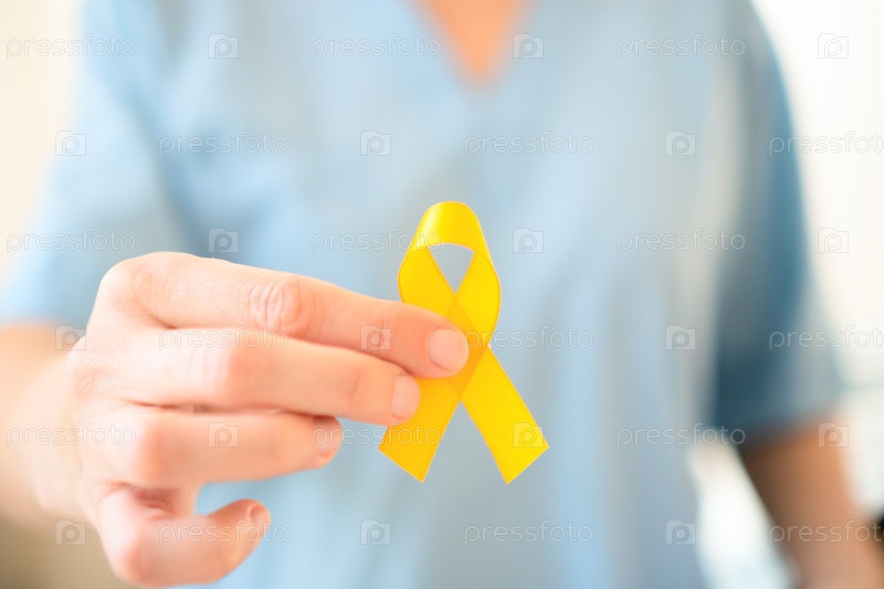 Рука женщины-врача или медсестры в форме, держащей желтую ленту.Символ борьбы с детским раком, медицинской поддержки, диагностики, лечения, семейного ухода и осведомленности