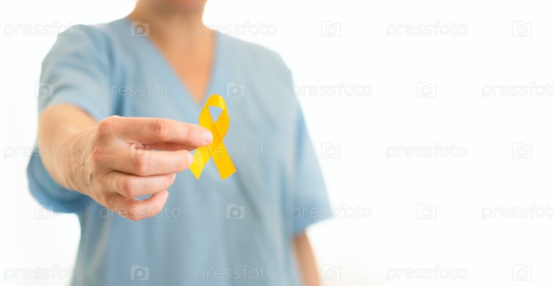 Рука женщины-врача или медсестры в форме, держащей желтую ленту.Символ борьбы с детским раком, медицинской поддержки, диагностики, лечения, семейного ухода и осведомленности