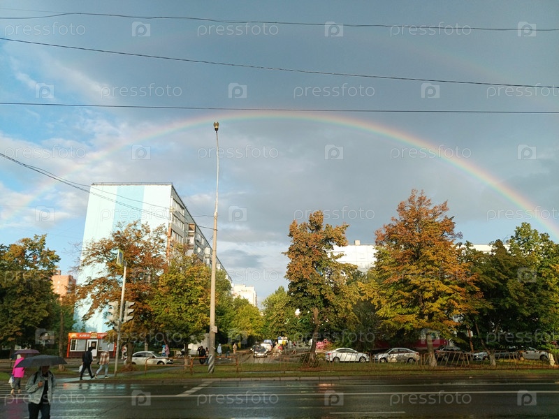 Радуга по улицам города во время дождя.Ну, погода!