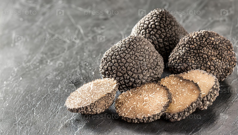 Черные трюфели тверды и нарезаны на каменную поверхность, символизируя гурманский ингредиент, кулинарную роскошь, изысканный ресторанный опыт и эксклюзивную тенденцию в высококлассной гастрономии