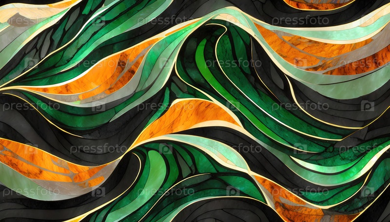 Красочные витражи с зелеными, оранжевыми и черными гладкими формами символизируют искусство, творчество, разнообразие, культурное выражение и современный дизайн
