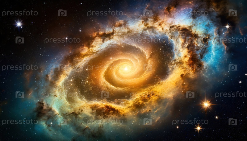Спиральная галактика светит в космосе с золотыми и синими облаками, символизирующими чудо, бесконечность, космическую энергию и исследования, отражающие стремление человечества к знанию и вселенной