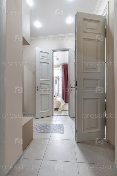 Яркий и элегантный коридор с белыми двойными дверями, открывающимися в уютную спальню, наполненную мягким светом и теплыми тонами