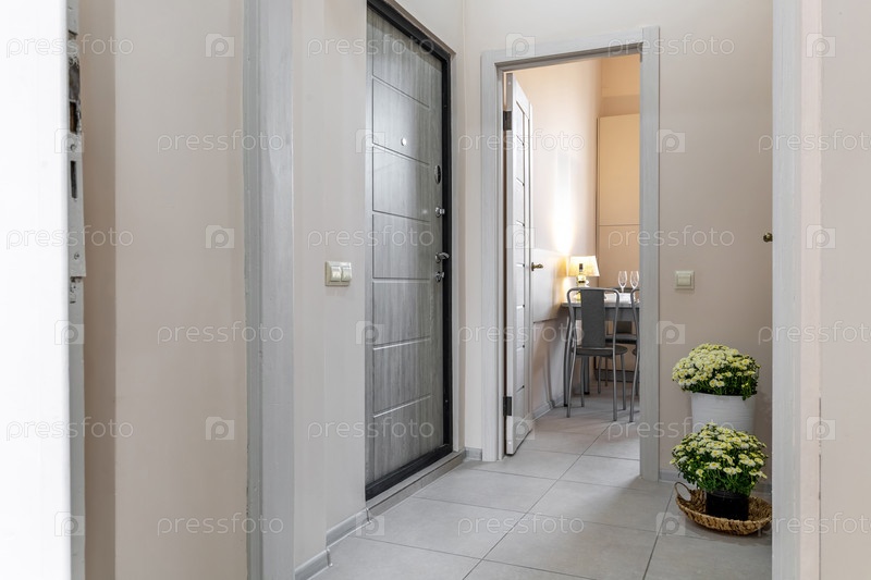 Современный вход с цветами и открытой дверью на кухню