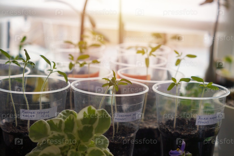 Саженцы томатов растут в подписанных чашках рядом с другими комнатными растениями