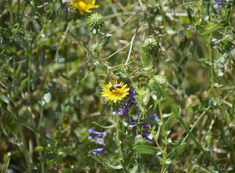 Маленький желтый полевой цветок с пчелой, сидевшей на нем и собирающей нектар.Фото иллюстрирует спокойствие летнего дня и красоту природы в деталях