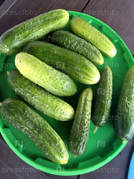 Свежевыбранные огурцы на пластиковой крышке ведра