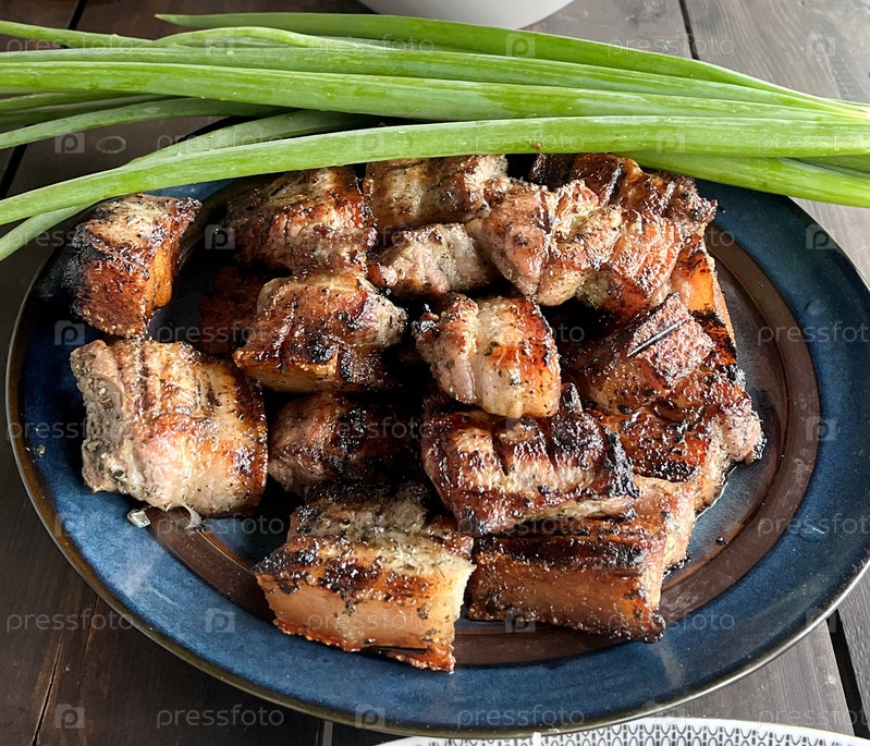 Барбекю на синей тарелке с зеленым луком