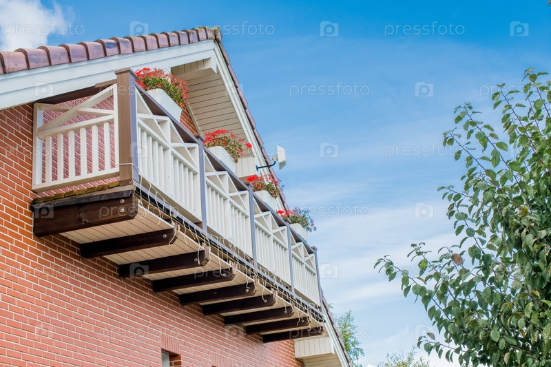Балкон дома украшен красными цветами на чистом голубом небе, демонстрируя архитектурные детали и естественную красоту для концепции жилого дизайна
