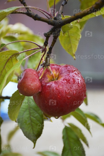 Зрелое красное яблоко на ветке дерева в саду. плоды растут. капли воды после дождя сливают кожуру фруктов. правильное питание и витамины