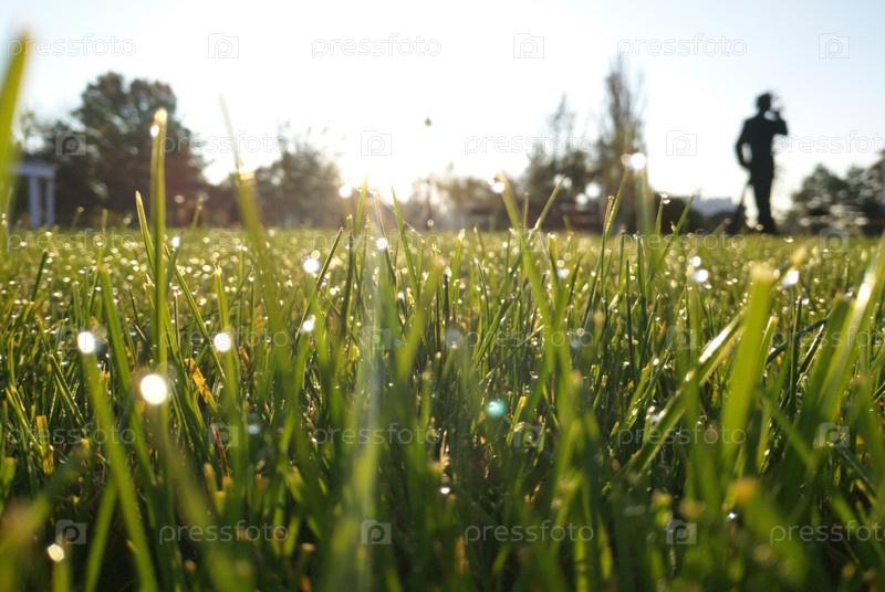 Зеленая трава с утренней росой капли в лучах восходящего солнца