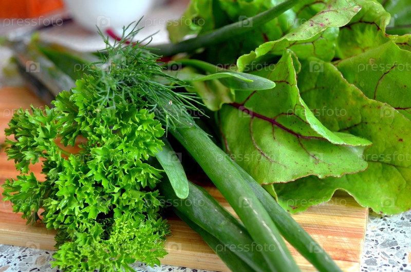 Различные зеленые на столе. зелёный лук, уксус, пеллетки, сельдерей, хрящ