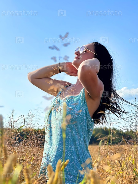 Женщина на солнечном пшеничном поле в летний день