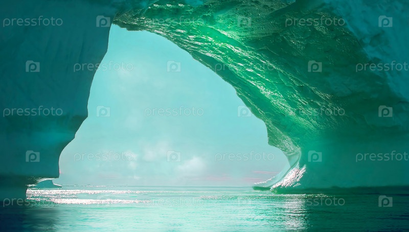 Потрясающий вид на блестящий бирюзовый океан за великолепной естественной ледниковой аркой