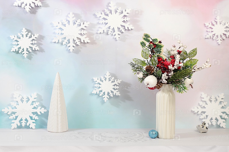 Рождественский и новогодний макет для дизайна продукта и отображения с снежинками и творческим рождественским букетом свежих веток сосны и украшений на праздничном фоне