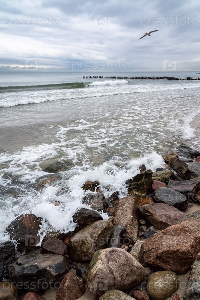 Камни и деревянные водохранилища на пляже Зеленоградска