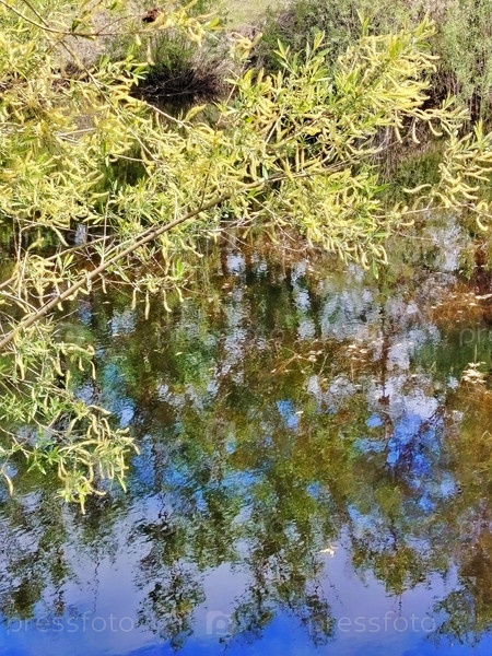 Ветка цветущей ивы над прудом