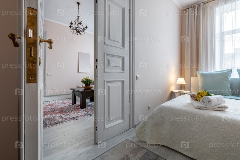 Яркий элегантный интерьер квартиры с уютной спальней с мягким освещением и открытой дверью, ведущей в стильную гостиную