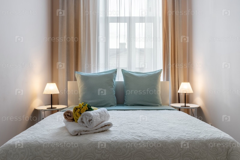 Яркий минималистический интерьер спальни с пастельными подушками, мягким освещением и аккуратно расположенными полотенцами на белом одеяле