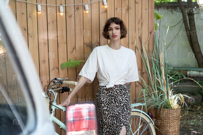 Красивая молодая женщина позирует на пикнике летом