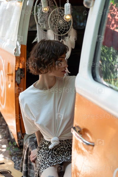 Красивая молодая женщина позирует на пикнике летом