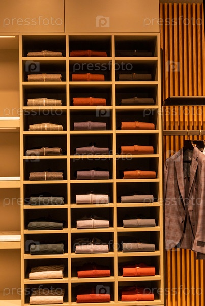 Фронтальный вид открытых деревянных полок витрины с различными сложенными на них свитерями Витрина торгового павильона в магазине Образец