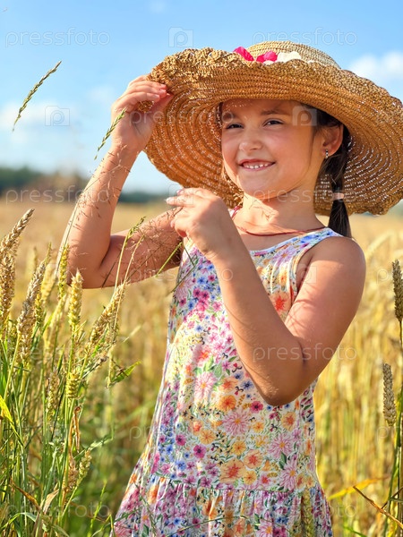 Улыбающаяся девушка в соломенной шляпе стоит на пшеничном поле в солнечный летний день