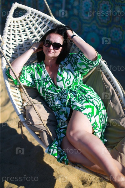 Туристка отдыхает на висячем кресле, наслаждаясь летним отпуском на пляже