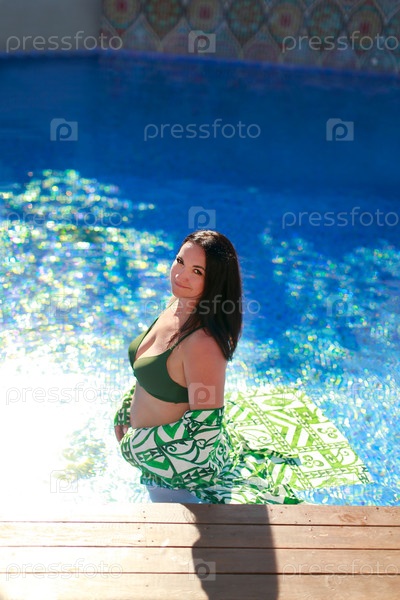 Беременная женщина отдыхает в бассейне в зеленом бикини и стильном пляжном платье