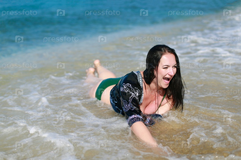 Счастливая женщина, лежащая на берегу и наслаждающаяся волнами моря