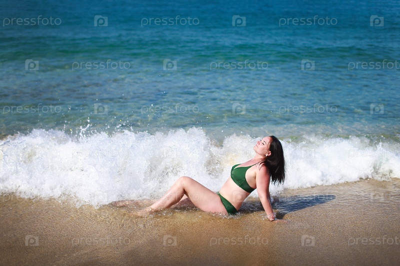 Женщина расслабляется на пляже, наслаждаясь океанскими волнами