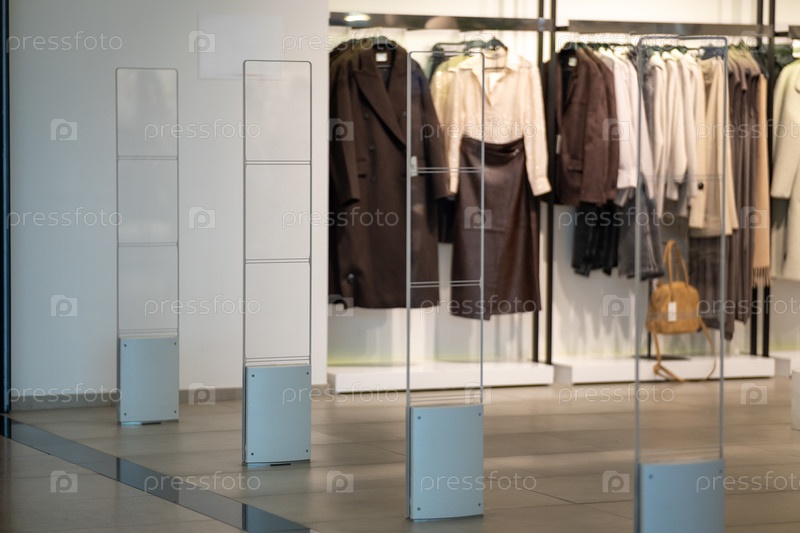 Гладкие прозрачные ворота безопасности стоят у входа в современный магазин одежды.Элегантный дизайн сочетается с интерьером, который заполнен стойками для пальто и одежды