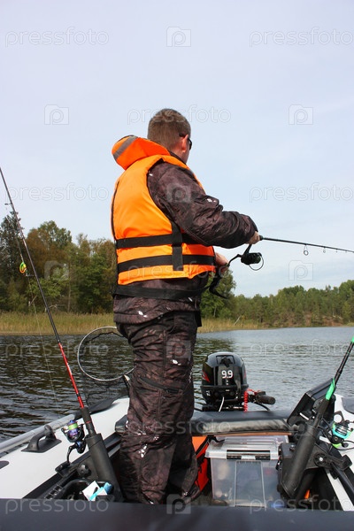 Мужчина ловит рыбу с лодки