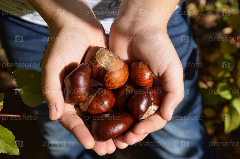 Несколько каштанов в руках ребенка