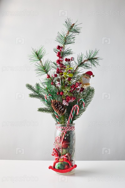 Рождественские аранжировки в вазе, букет веток елей и декоративные рождественские украшения