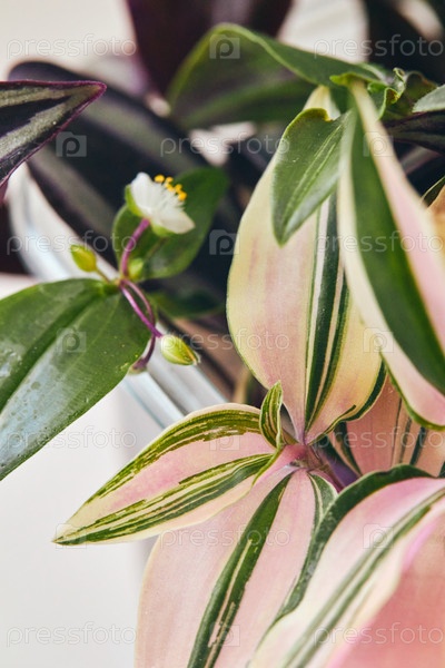 Близкий план полосатых зеленых и фиолетовых листьев Tradescantia zebrina