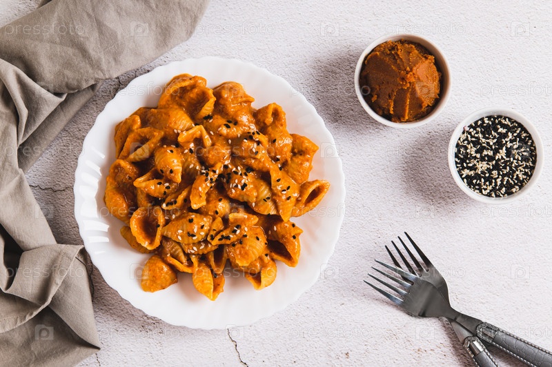 Пикантная паста из мисо на тарелке с видом на стол