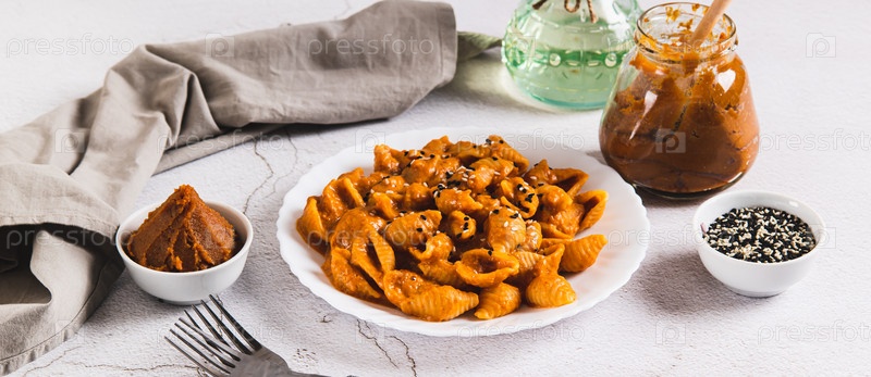 Пикантные раковины мисопасты на тарелке стула WEB-баннер
