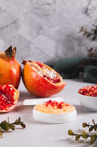 Крем для ухода за кожей из граната в банке и фрукты на столе вертикальный вид
