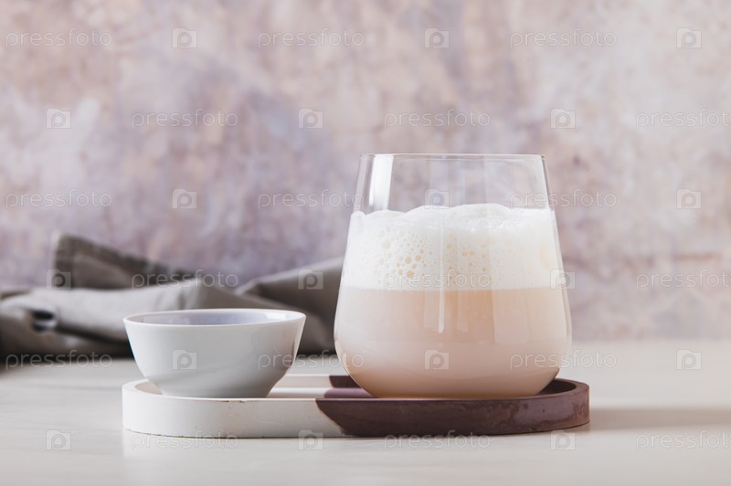 Туманный розовый матч в стакане с воздушной пеной на столе