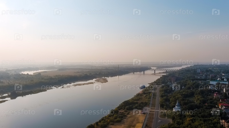 Муром, Россия. река Ока, паводковая равнина железнодорожный мост через реку Ока, вид с воздуха