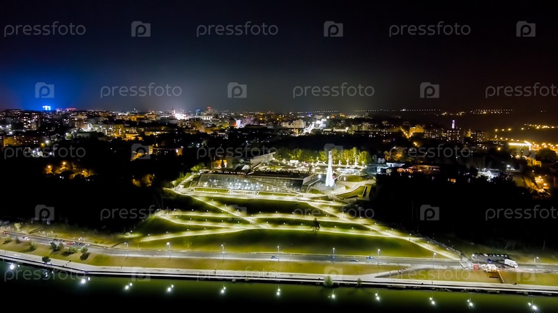 Калуга, Россия. Яченская набережная. Космическая ракета. Ночной полет над городом, вид с воздуха
