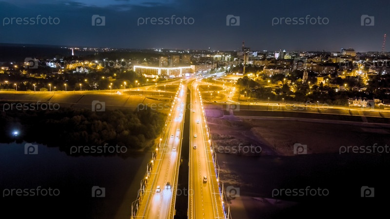Калуга, Россия.Вход в центр города через переулок Калуги Гагарина и мост Гагарина.Ночные огни, вид с воздуха