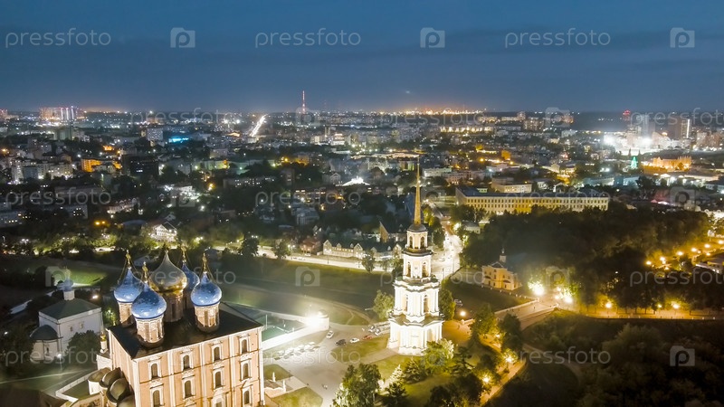 Рязань, Россия.Ночной рейс.Рязанский Кремль - самая старая часть города Рязани.Кафедральный собор Успения Пресвятой Девы Марии, вид с воздуха